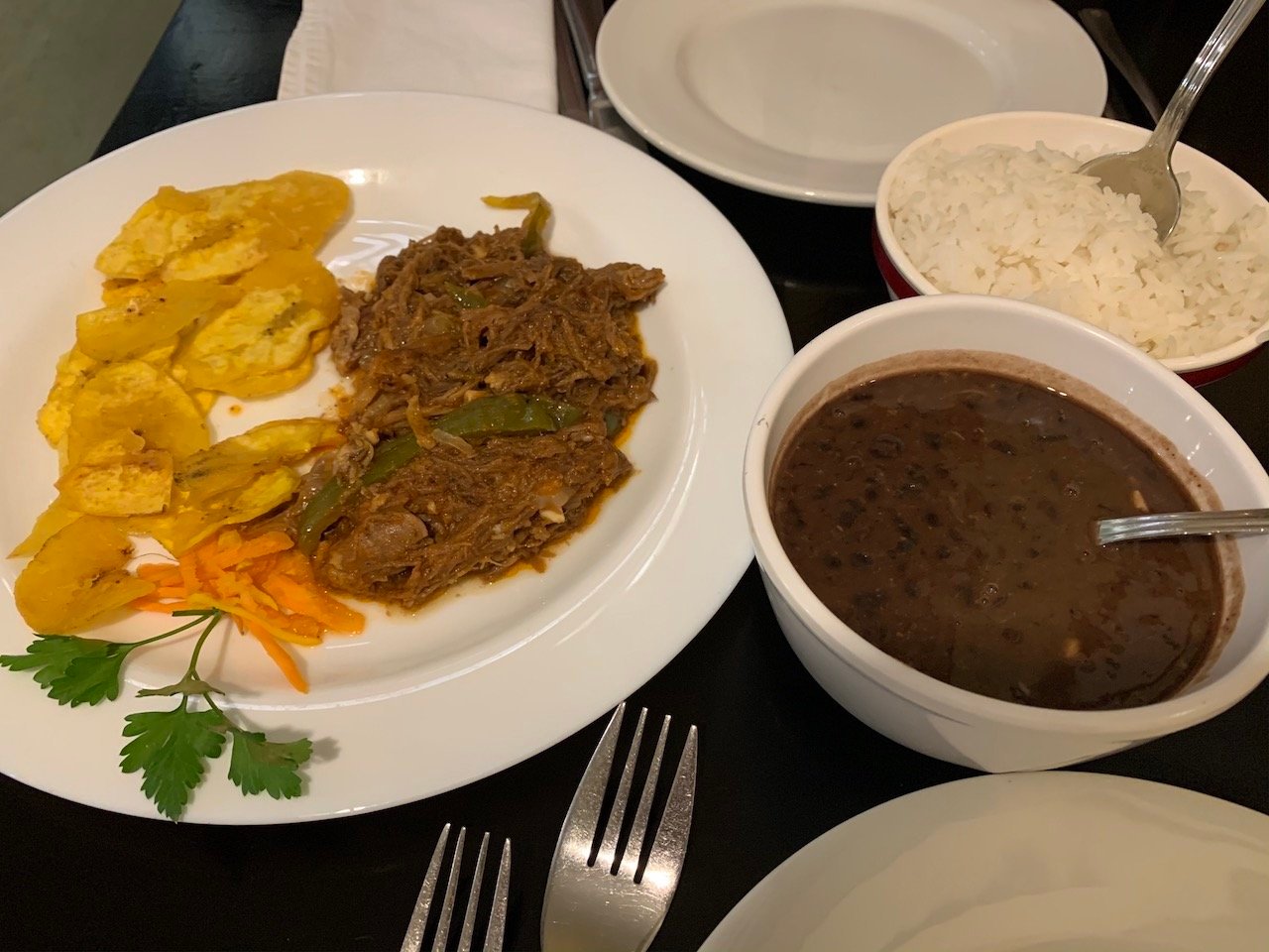 En La Habana te recomendamos probar la comida típica en Paladares, que son restaurantes privados (no del Estado). Las comidas que más nos gustaron fueron la Ropa vieja, los tostones rellenos y la fritura de Malanga.