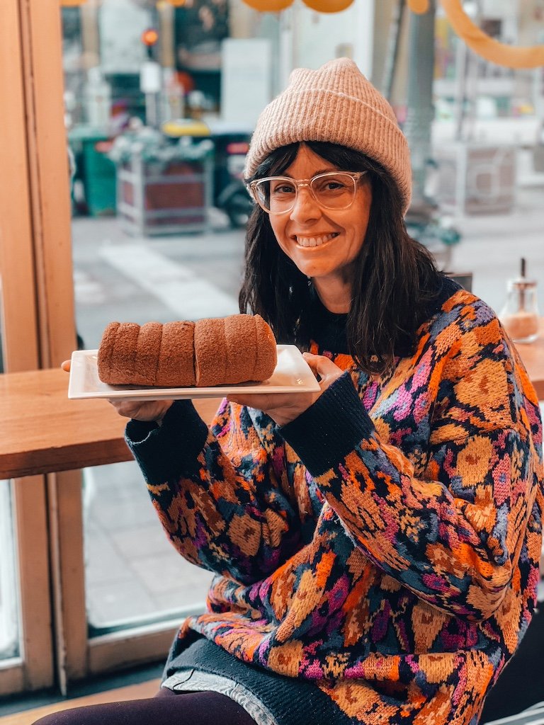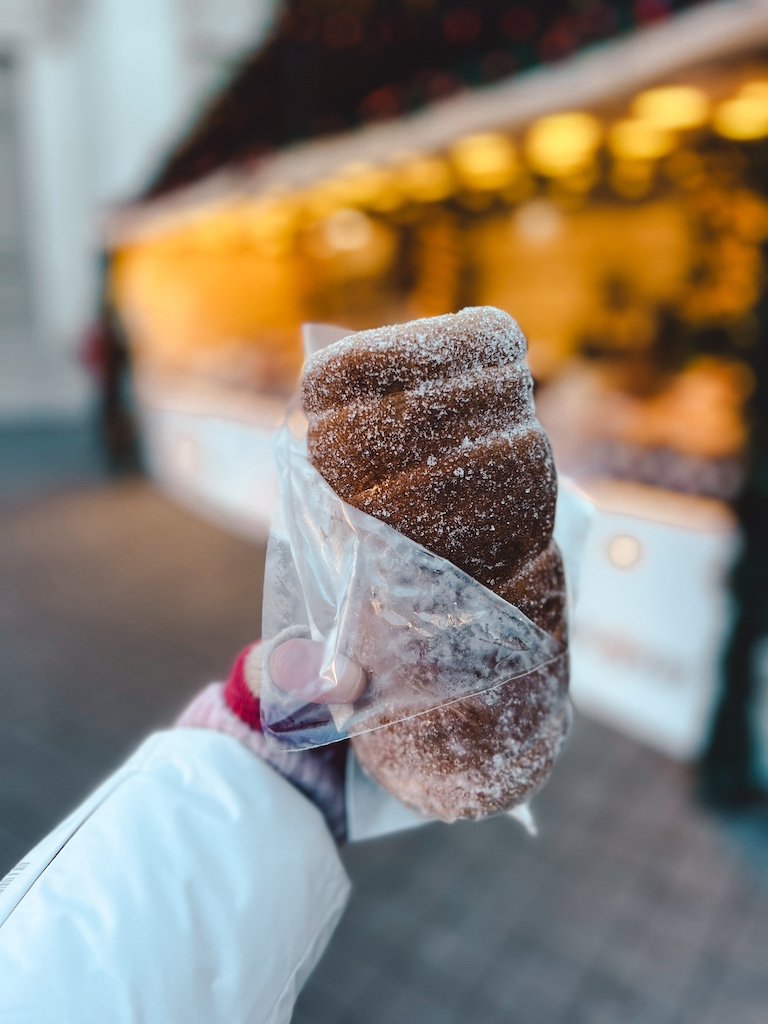 • Chimney Cake (Kürtőskalács): Este dulce tradicional es un favorito en los mercados navideños. Se prepara enrollando masa dulce alrededor de un cilindro y cocinándola sobre carbón hasta que queda crujiente por fuera y esponjosa por dentro. Luego, se cubre con azúcar, canela, nueces o cacao. Esta buenísimo y los vas a ver en todas partes. También te recomendamos probarlo en Gelateria Pichler, uno de los mejores Chimney Cake de Budapest.
