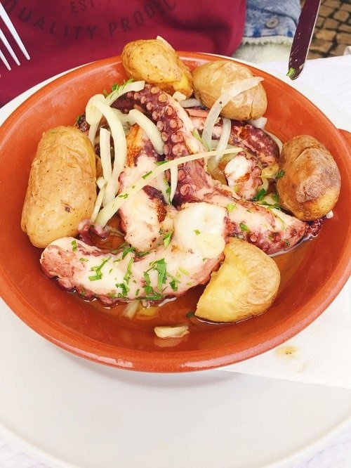 Comimos un plato de pulpo y otro de bacalao con 2 cervezas por 37 euros. Casi todos los platos de pescado en Lisboa van acompañados de ensalada o verduras y patatas asadas.
