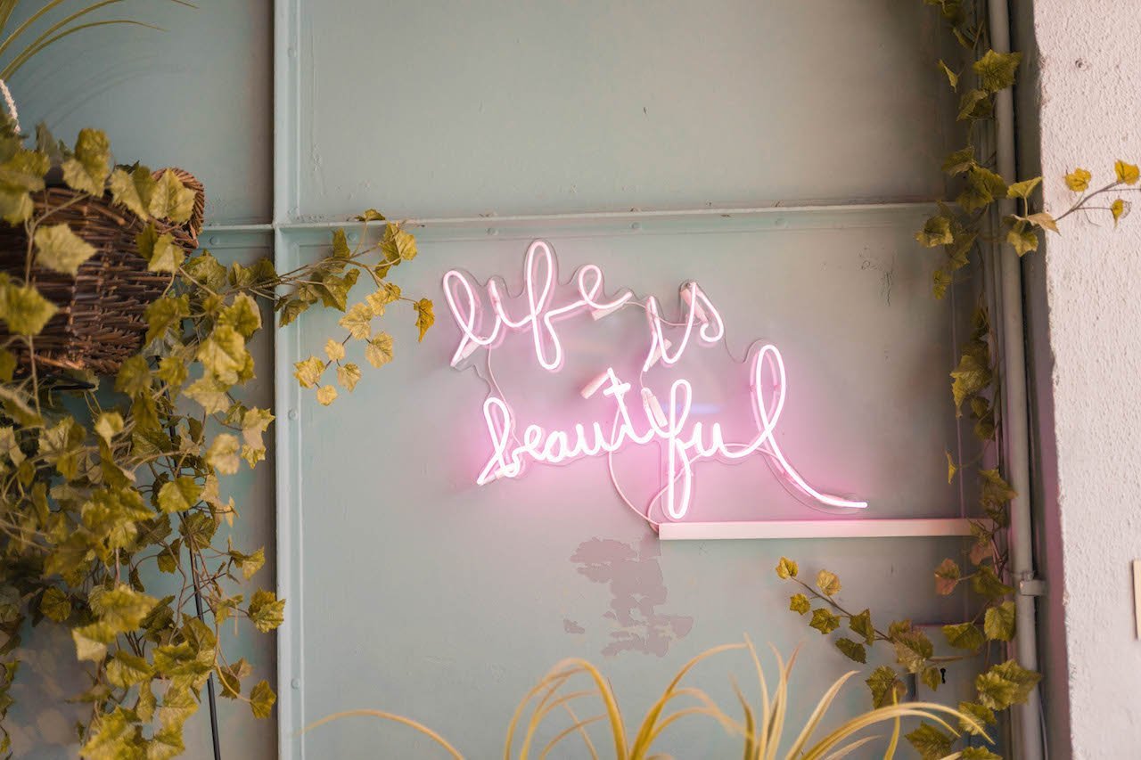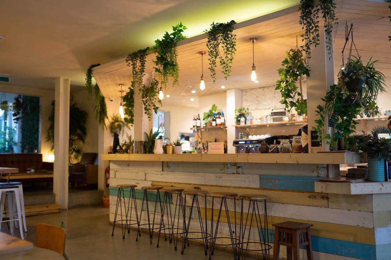 Una cafetería decorada con plantas y neones súper chula.
