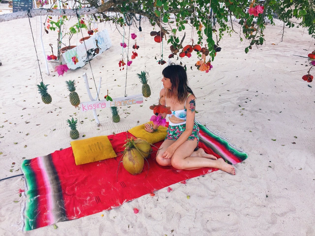 Este sitio es una pasada, muebles de madera gastada, hamacas, corales, piñas y flores colgando de los árboles, columpios, hasta un Photocall súper bonito. Un sitio chulísimo que os recomendamos para comer, cenar o tomar algo mirando al mar.