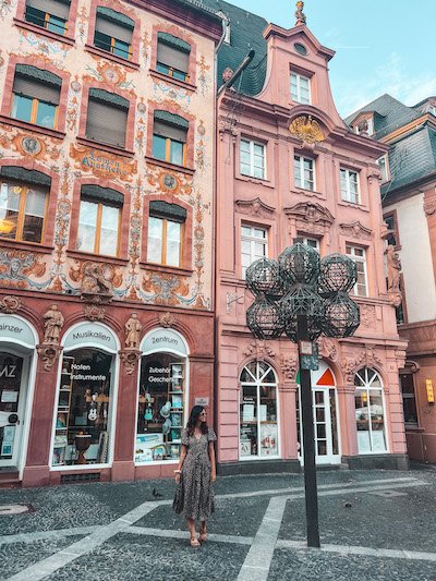 Otra de las plazas que tienes que ver en Mainz. Con su gran fuente y rodeada por preciosos edificios de color rosa.