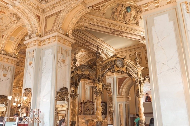 El New York Café es trasladarse a 1895. Con sus lámparas de cristal veneciano, paredes y columnas doradas. Super elegante. Es posible que tengas que hacer fila y pagar unos 5 euros por un café, que sinceramente no tenía muy buena pinta. Nosotros fuimos a verlo solamente. ¡Somos más de Ruin Bars con una cervecica!