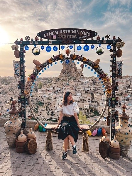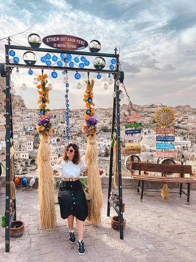 Puedes ver todo el valle desde sus miradores. Como en toda esta zona de Capadocia, los miradores están decorados con un montón de columpios, asientos donde hacerte fotos, hay terrazas y puestos o bares donde tomar algo. Nos encantó lo bonito que decoran todo, cuidando hasta el más mínimo detalle.