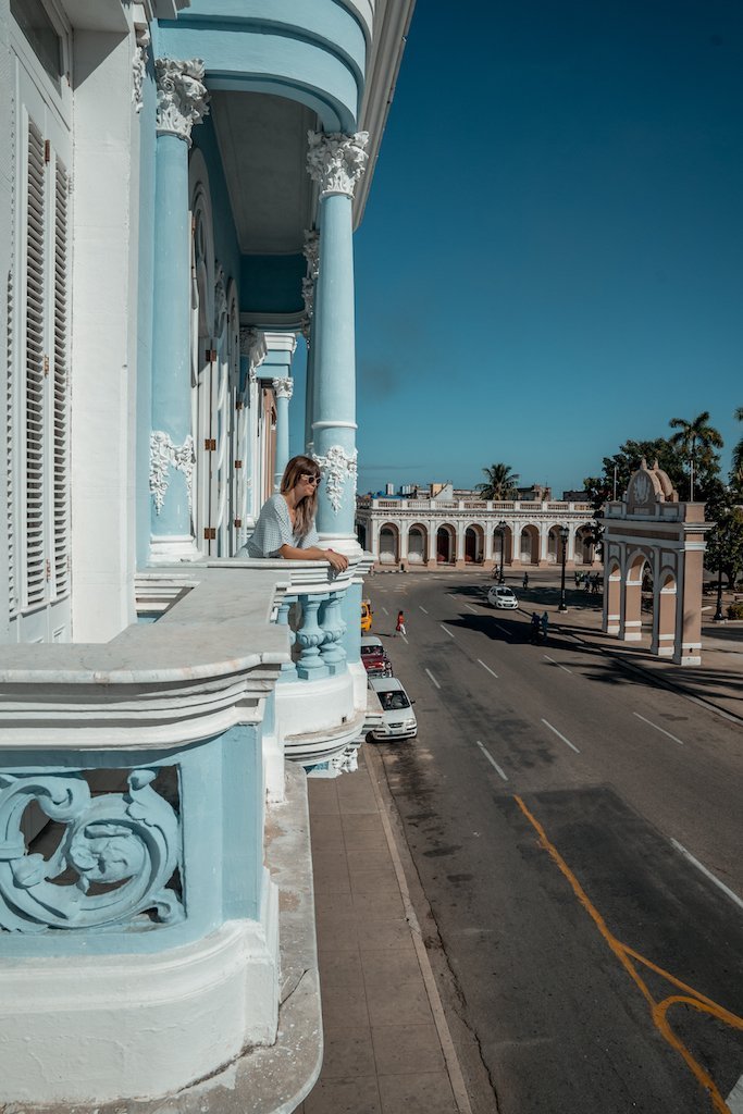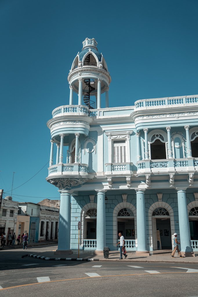 Este Palacio de color azul intenso es una joya en Cienfuegos. Te recomendamos mucho una visita al interior, para ver cada una de sus salas y subir al mirador, ya que tiene unas bonitas vistas de la ciudad. Para entrar pagamos 2 CUC por persona.