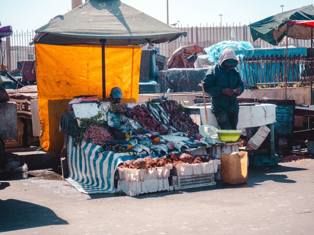 La Plaza del Mercado de Pescado (Fish Market), la más auténtica de todas y un lugar que tienes que ver en Essaouira. En el centro de la plaza se reparten diferentes puestos con todo tipo de pescado y marisco recién llegado del puerto que puedes comprar y comer en los locales situados en los laterales. ¡Más fresco imposible!