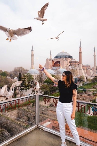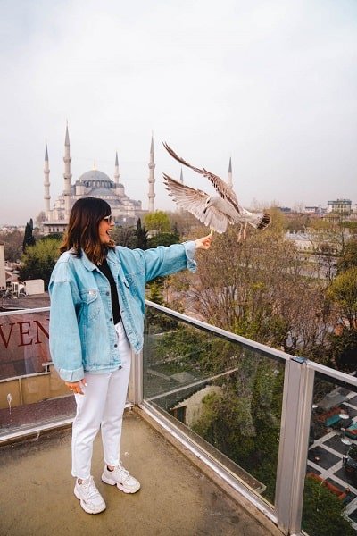 Aunque no estés alojado en el hotel, puedes subir a tomar algo, desayunar, comer o cenar en la terraza y disfrutar de las vistas a la Mezquita Azul y Santa Sofía. Además, puedes intentar hacerte una foto con las gaviotas. ¡Todo un reto! Nosotros fuimos a primera hora de la mañana, para desayunar el típico desayuno turco, pero también puedes ir a comer o a cenar y ver el atardecer o disfrutar de la ciudad iluminada desde la terraza.