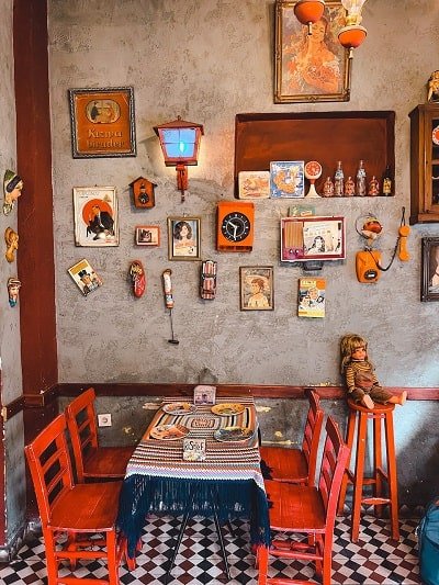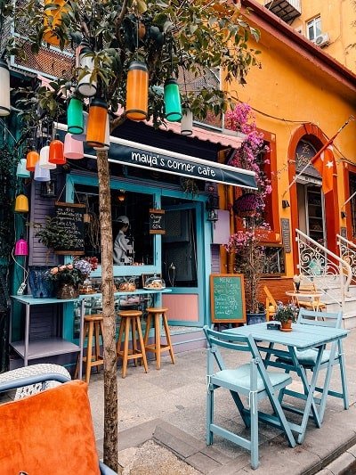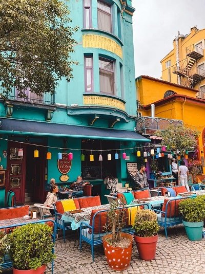 Aparte de callejear y perderte por sus calles, uno de los lugares que ver en Estambul que no te puedes perder, es Balat Antik Cafe, una cafetería al aire libre muy colorida, con paraguas y casetas de madera de colores donde sentarte a tomar algo o comer.