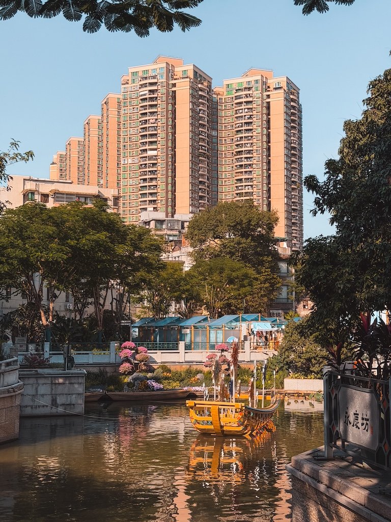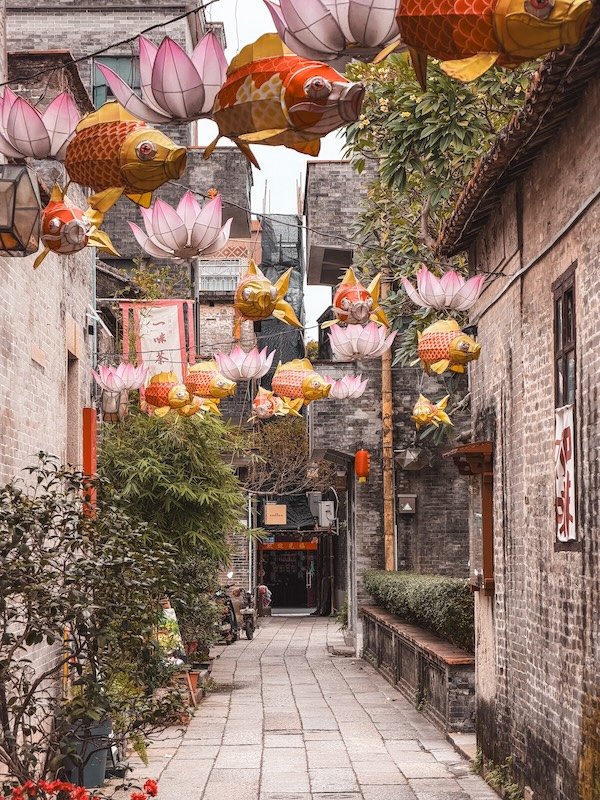 Es una ciudad tradicional con casas antiguas, templos, canales y calles tranquilas. Ideal para conocer el pasado de la región y contrastar con la Guangzhou más moderna. A nosotros nos gustó mucho. Las calles están decoradas con farolillos, peces, murales… hay muchas cafeterías bonitas y tiendas tradicionales.