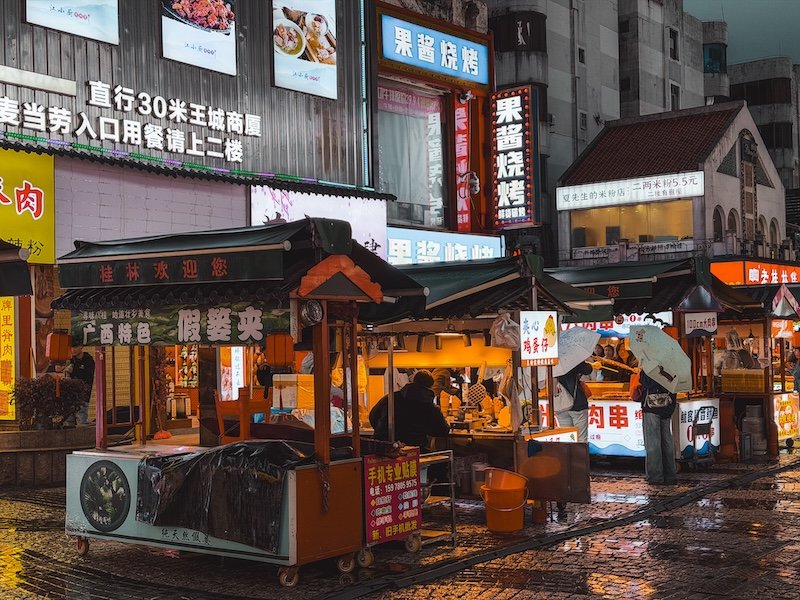 La calle peatonal más animada de Guilin. Aquí encontrarás tiendas, souvenirs y, sobre todo, muchos puestos de comida callejera donde probar especialidades locales. Recomendable por la tarde noche cuando montan los puestos de comida.