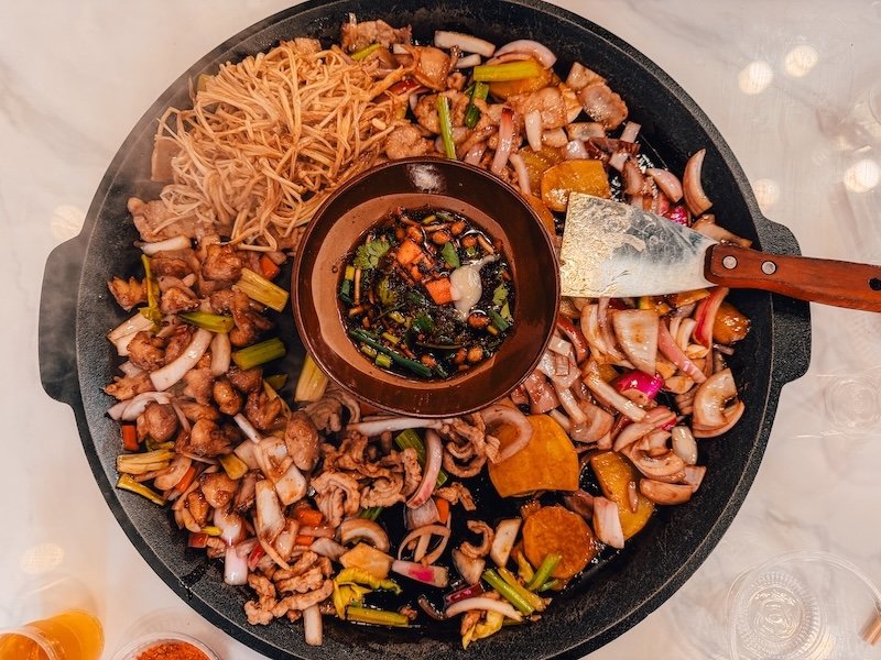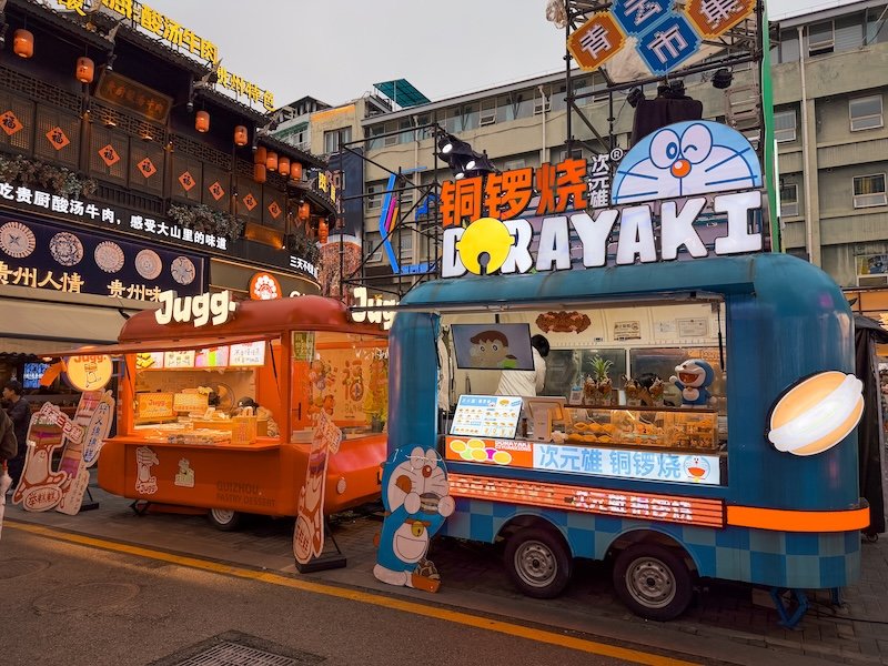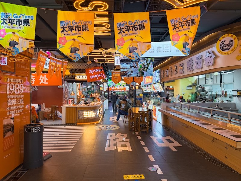 Qingyun Road Pedestrian Street & Night Market: Esta calle es el epicentro de la vida nocturna. Recientemente renovada, combina un estilo retro con luces neón modernas. Es el lugar ideal para pasear al atardecer y perderse en su Night Market, donde podrás probar snacks locales en un ambiente vibrante y lleno de arte urbano. También puedes probar la famosa barbacoa típica de Guizhou. Nosotros cenamos en Shui Cheng Luo Guo.
