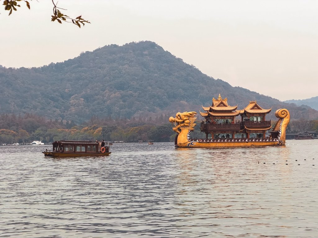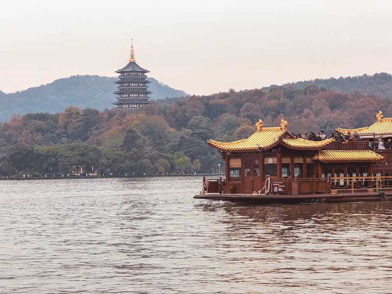 El paseo en barco es una maravilla porque puedes disfrutar de las vistas del lago y de todos los templos y pagodas que lo rodean, como la Pagoda de Leifeng.