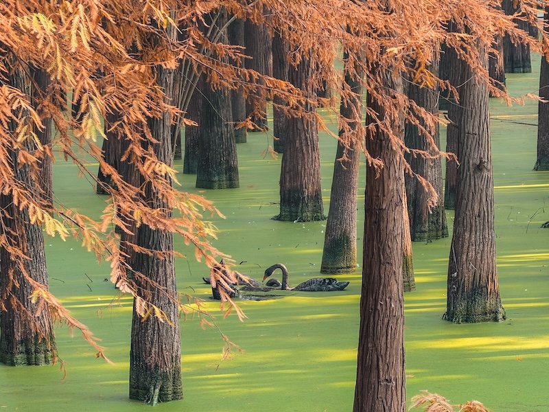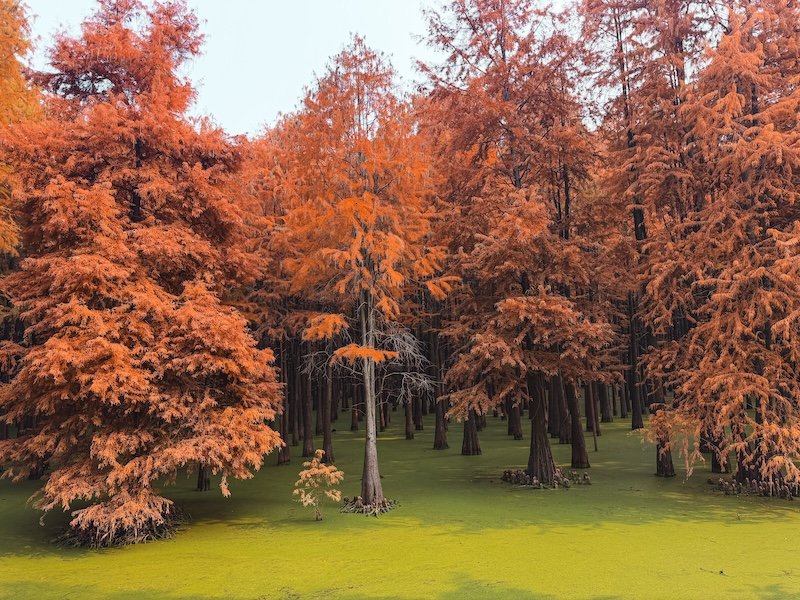 Uno de los lugares más sorprendentes cerca de Hangzhou es el Qingshan Lake Water Forest, un bosque de árboles que crecen dentro del agua, creando un paisaje espectacular, especialmente en otoño. Es ideal para hacer fotos y paseos en barca. Se pueden ver cisnes negros y si tienes suerte incluso ciervos. También puedes alquilar un vehículo y dar un paseo bordeando una parte del lago. Si vas en otoño el paisaje es totalmente de cuento.