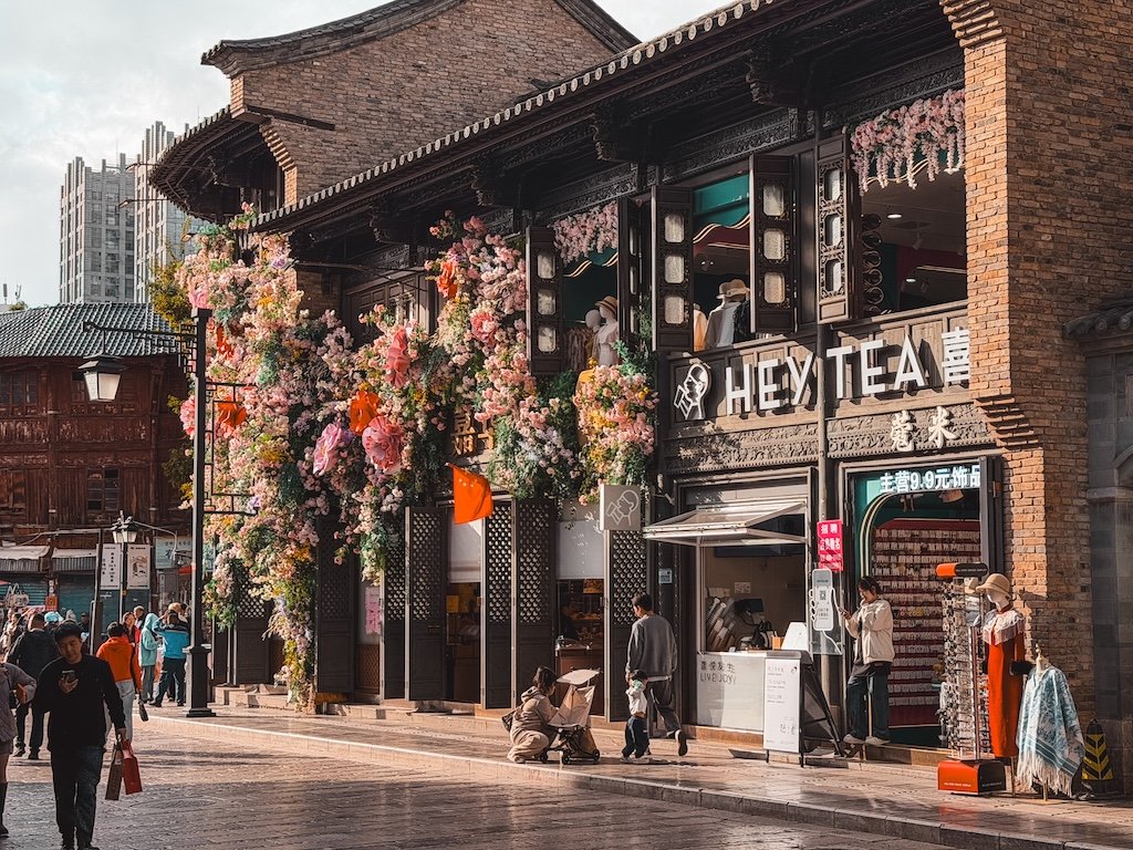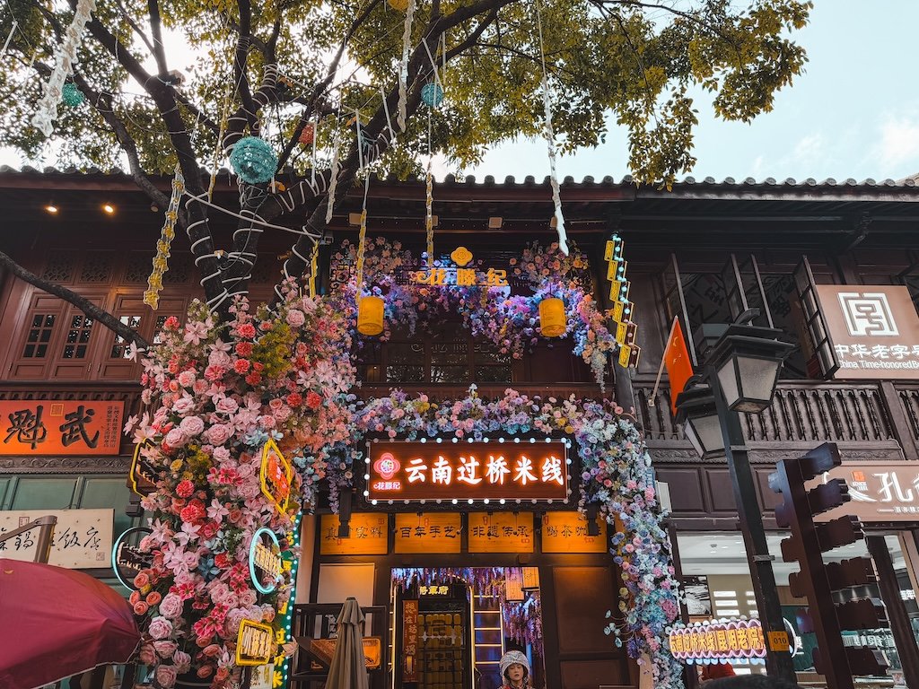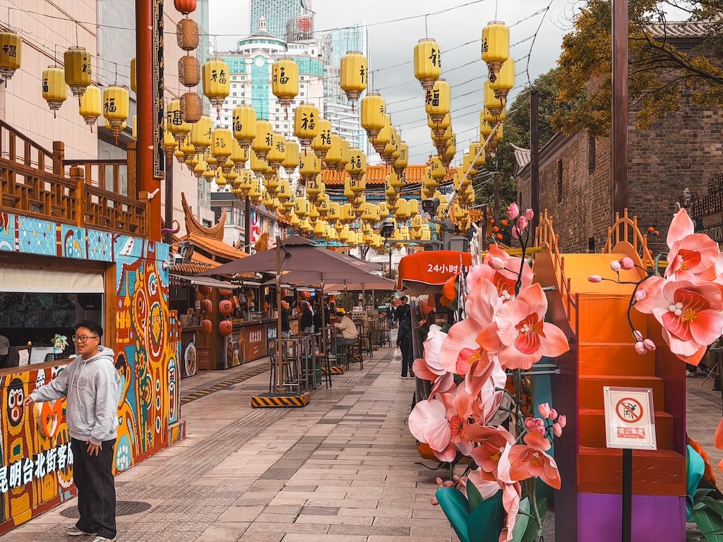 Hay muchas zonas comerciales, con muchos restaurantes, decoraciones muy bonitas, varios mercados nocturnos con mucha comida callejera, muchas cafeterías, ya que en esta zona se cultiva el café de Kunming, la comida es buenísima y también puedes ver algunas cosas en los alrededores.