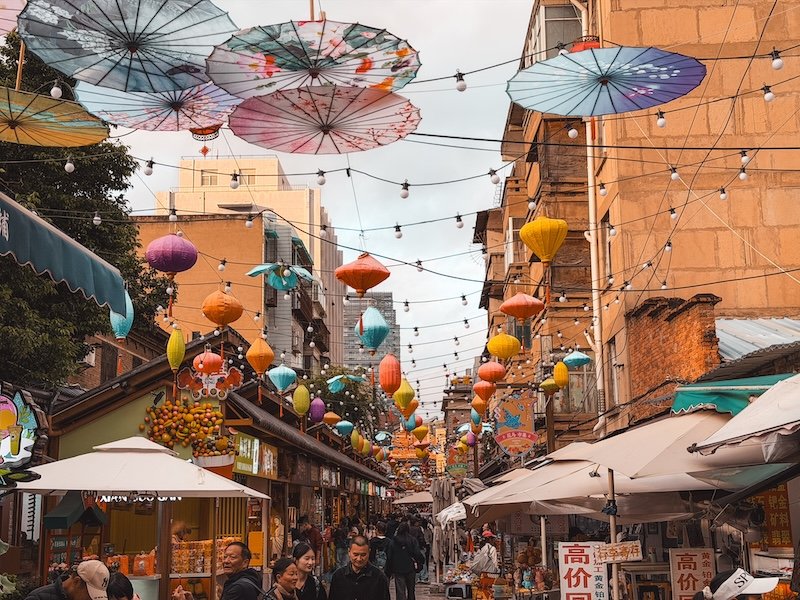 Es una calle histórica cerca de la Universidad de Yunnan y de Green Lake Park. La calle está llena de tiendas, restaurantes y cafeterías, y es un lugar popular para los locales.