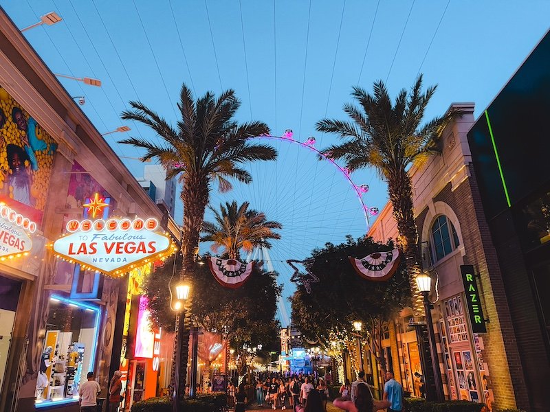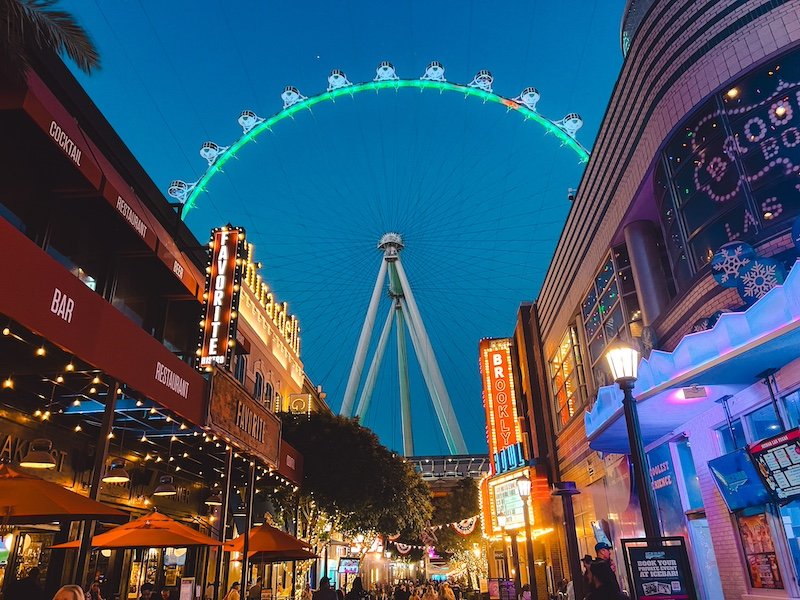 Aparte de visitar los hoteles no te puedes perder la calle The LINQ Promenade. Llena de ambiente, sitios de comer, luces, neones, tiendas…. Lo más famoso esta avenida es su High Roller Observation Wheel. Esta noria de 165 metros de altura, cuenta con 28 cápsulas desde las que puedes disfrutar de unas impresionantes vistas del Strip de Las Vegas durante 30 minutos.