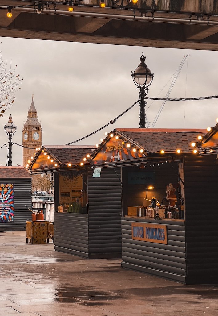 Aquí podemos encontrar las típicas casetas de madera decoradas con luces, puestos con souvenirs y decoración, todo ello acompañado por villancicos y del London Eye y el Big Ben de fondo. Hay también puestos con comida para llevar y eventos especiales.
