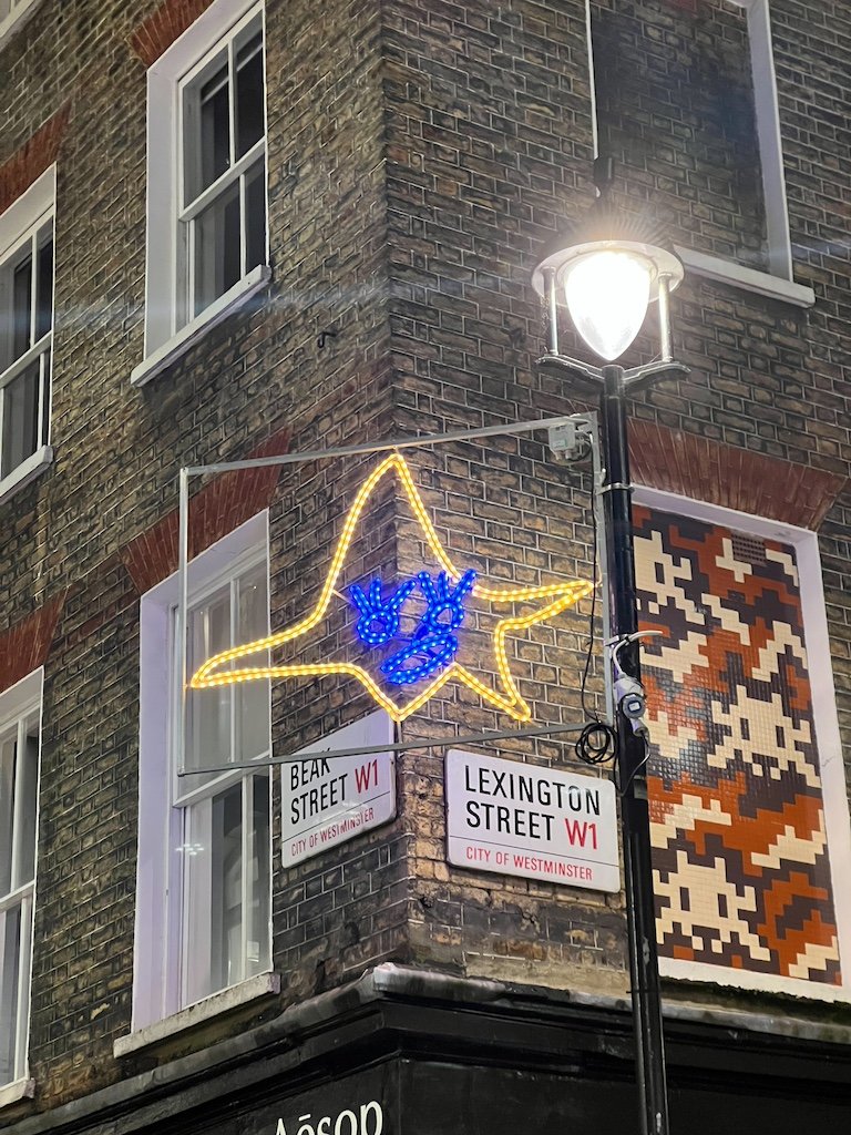 - Luces de Navidad en Carnaby Street: Cada año eligen una temática especial. El encendido de luces de Carnaby Street en 2025, es el 6 de noviembre. En nuestro post de que ver en Londres te dejamos más información de lo que puedes hacer en esta zona. Este año son las que menos nos han gustado.