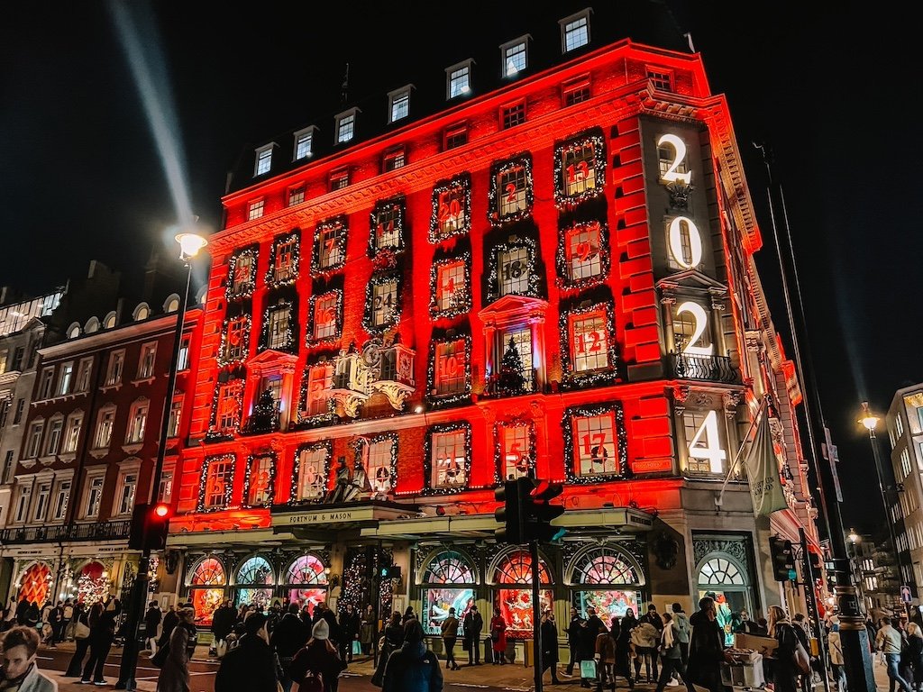 - Fortnum & Mason. Este año su fachada es un precioso calendario de adviento. Dentro puedes comprar calendarios de adviento de chocolates de todo tipo, cajas de galletas y de té.