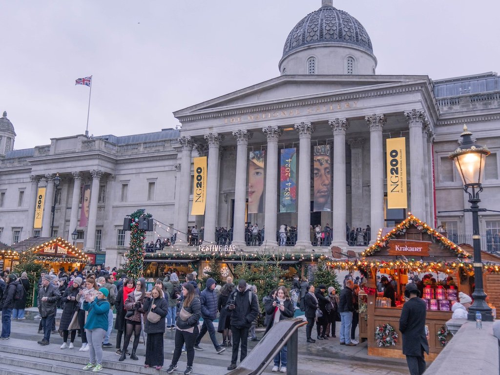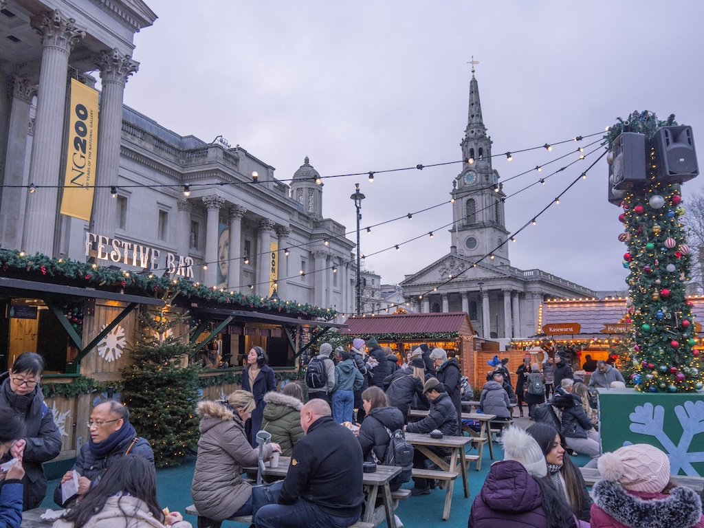 En Trafalgar Square, una de las plazas más importantes de Londres también puedes disfrutar de un mercado navideño. Hay puestos con adornos, artesanía, souvenirs y comida como salchichas, hamburguesas, patatas…. También vas a encontrar dulces y bebidas.