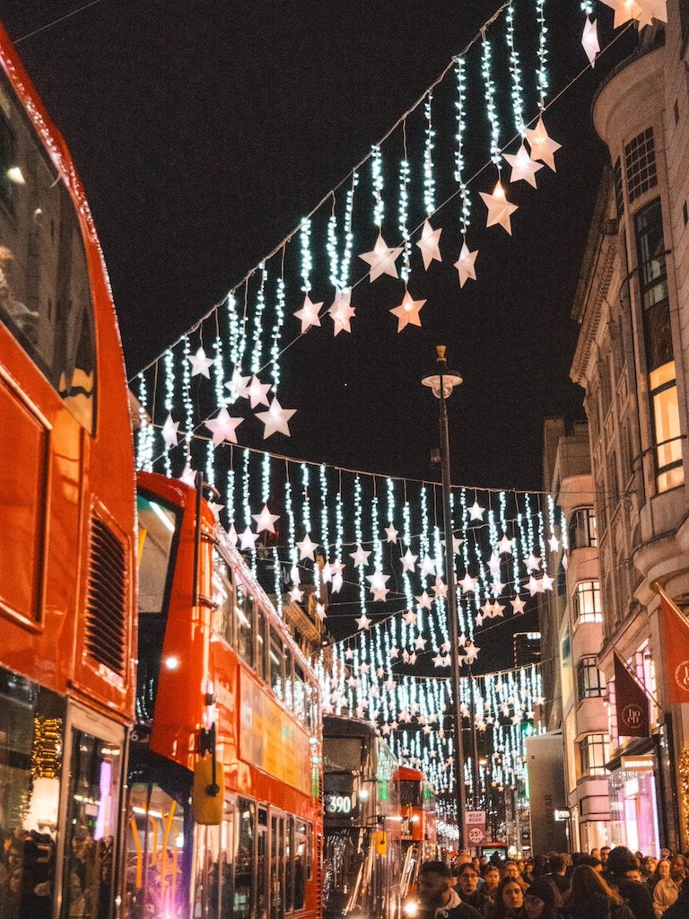 Una forma diferente de ver estas luces navideñas, es subir a un autobús de 2 pisos, concretamente a la línea 139 y conseguir sentarte delante en la segunda planta. Puedes verlo aquí. Nosotros fuimos a la primera parada en Waterloo Station (y menos mal porque en la segunda parada se llenó). Y nos bajamos en Oxford Street a la altura de la Disney Store. Por menos de 2 libras haces el recorrido viendo las luces.