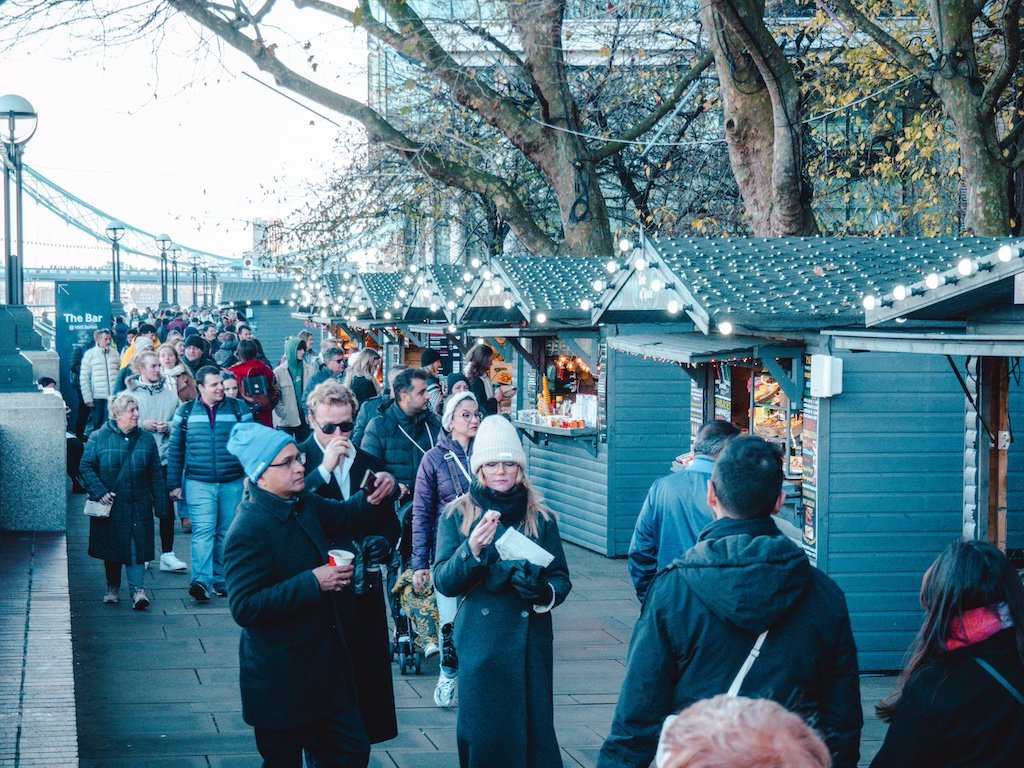 Si viajas a Londres en Navidad, otro mercado que tienes que visitar es el que se encuentra a orillas del Támesis, con el Tower Bridge de fondo. Para nosotros es de los más bonitos de la ciudad. Por las vistas, ya que los puestos están montados a lo largo de The Queen’s Walk y venden muchos adornos bonitos, comida de todo tipo y de muchas partes del mundo, dulces, souvenirs, suenan villancicos… Uno de los lugares imprescindibles en Londres en Navidad.