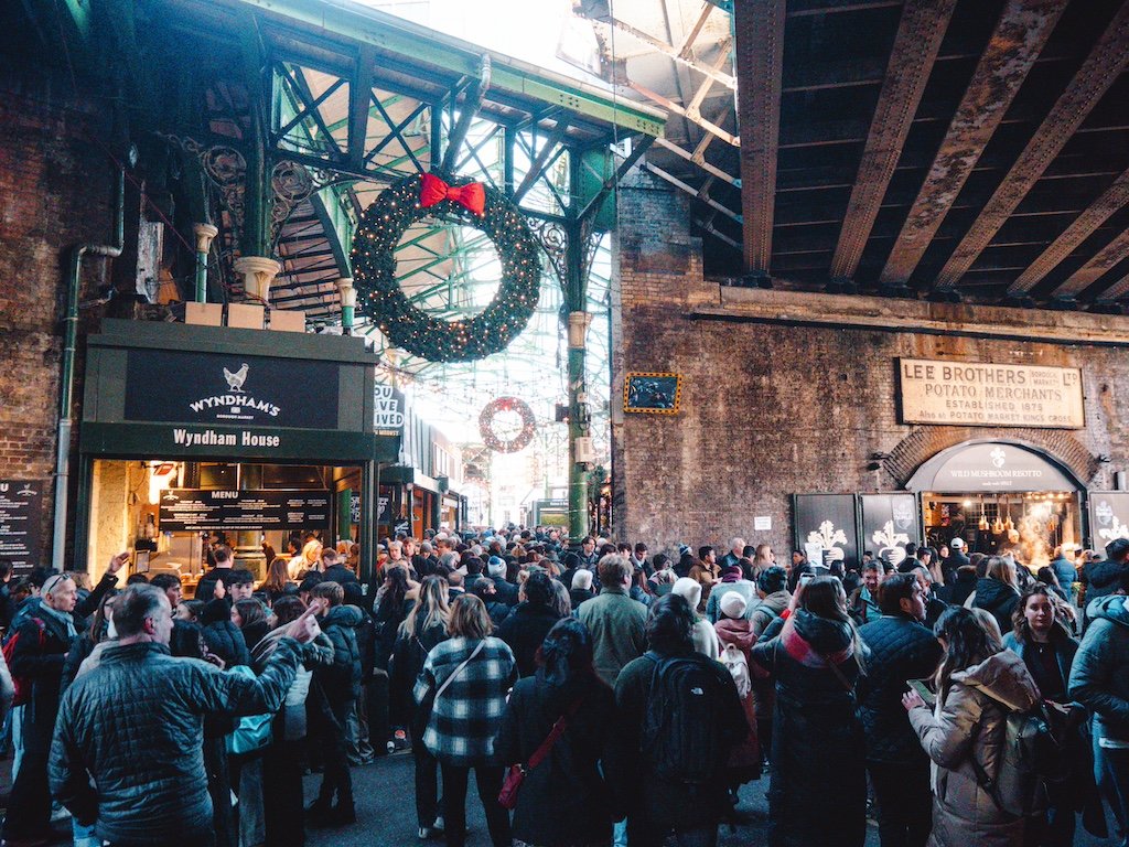 Este mercado es otro de los que recomendamos ver en Londres en Navidad. El mercado está abierto todo el año y merece la pena visitarlo siempre que viajes a Londres porque está ubicado bajo las vías del tren. Pero en Navidad está decorado especialmente. Aquí vas a encontrar infinidad de puestos de comida y dulces de todo tipo y Hau mucho ambiente.