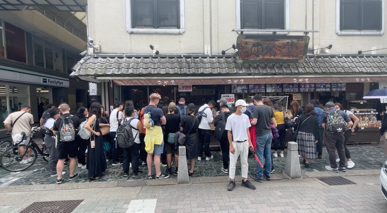Uno de los sitios más famosos, es Nakatanidou Mochi. Aquí venden supuestamente los mejores mochis de matcha. Y se han hecho famosos en redes, porque varias veces al día, salen unos señores a hacer los mochis de forma tradicional, que es dando golpes a la masa y haciendo unos ruidos muy curiosos. Pero cuando fuimos nosotros, era imposible verlo y no merecía la pena, ya que lo ves a través de un cristal con filas y filas de gente y apenas estaban 1 minuto. Pero si merece la pena probar los mochis.