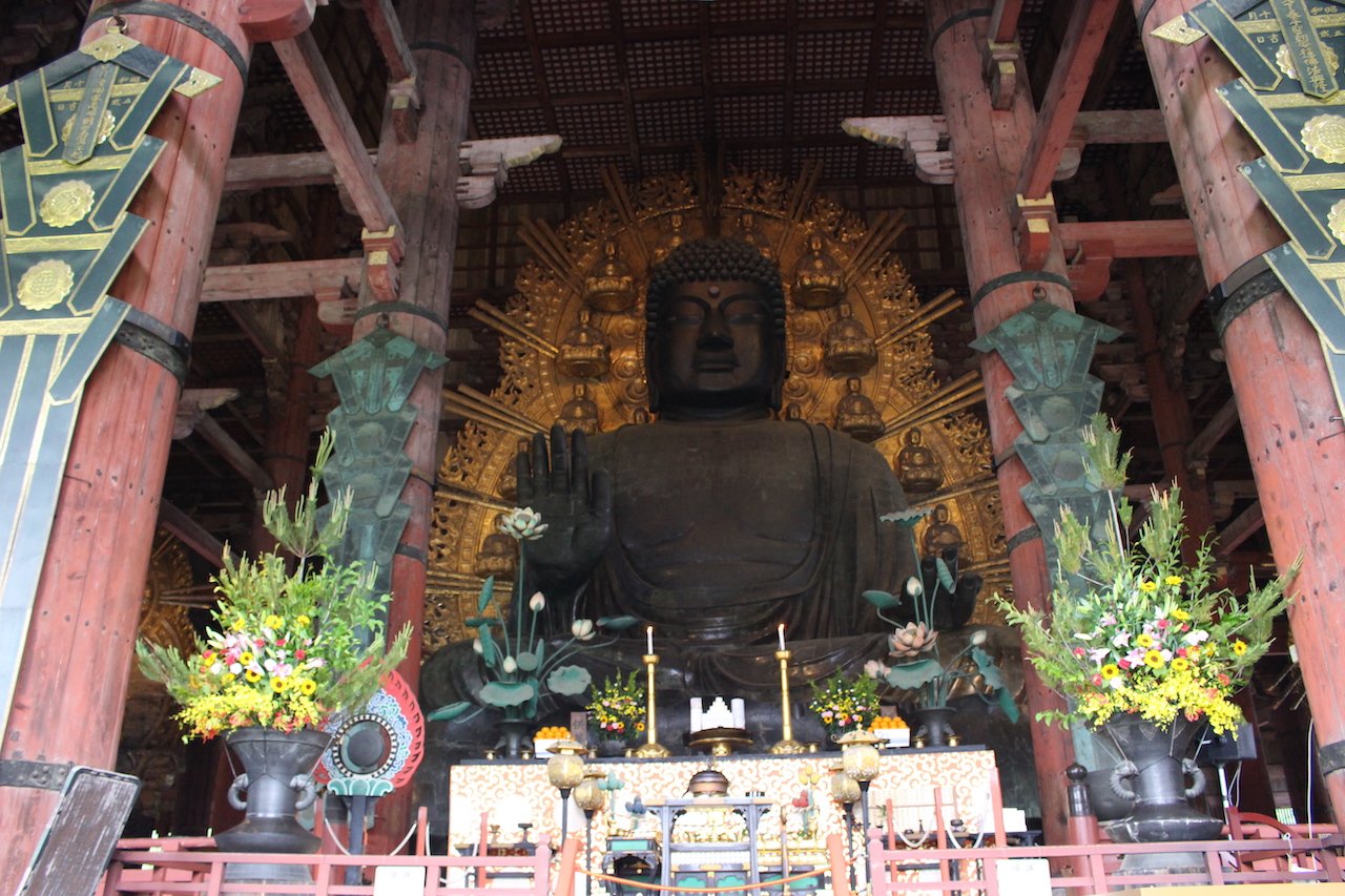 El Templo Todaiji, es el más famoso de Nara. Fue construido en el año 752 y en el interior se encuentra la estatua de bronce del Gran Buda, la más grande de Japón con más de 15 metros de altura. Su pabellón principal, el Daibutsuden, es el edificio de madera más grande del mundo.