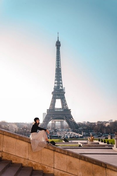 Madrugamos bastante para llegar sobre las 8 a Trocadero. De allí hay unas vistas preciosas a la Torre. Aunque ahora (marzo 2022), la zona está en obras y hay un muro de madera que tapa bastante las bonitas vistas. Pero aun así, merece la pena acercarse y bajando las escaleras, encontrarás un pequeño hueco sin maderas.