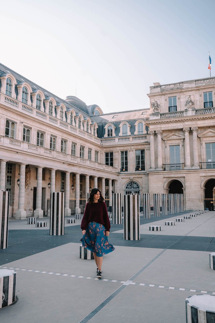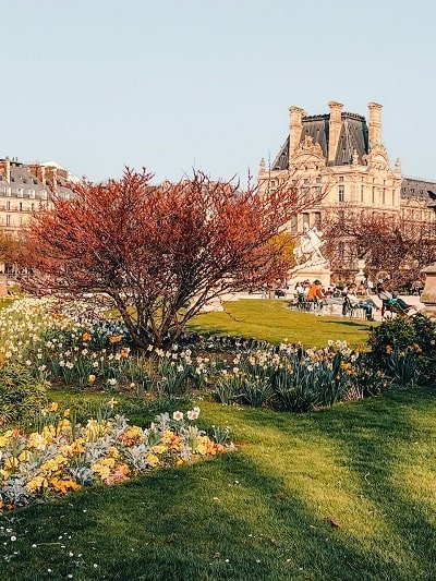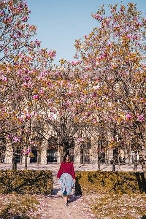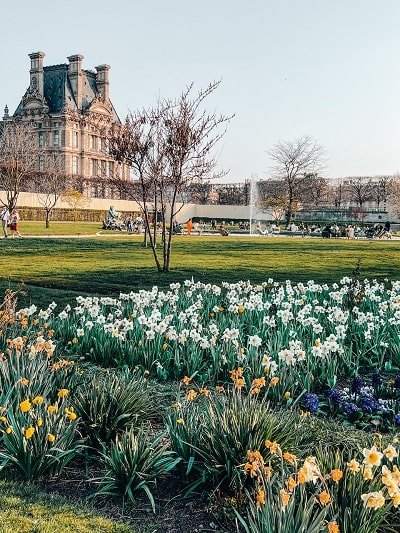 Empezamos nuestro recorrido del día visitando el Palais Royal o palacio Real. Sus jardines son una preciosidad y más en primavera, llenos de flores. También puedes ver aquí el famoso patio con columnas blancas y negras.