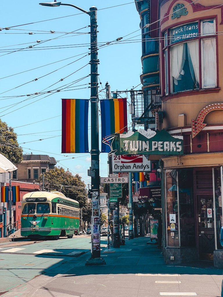 El histórico barrio de Castro, uno de los barrios icónicos de la cultura gay. Bonitas y coloridas fachadas, con un montón de banderas multicolores, el famoso Teatro Castro de 1922 y la conocida Twin Peaks Tavern.