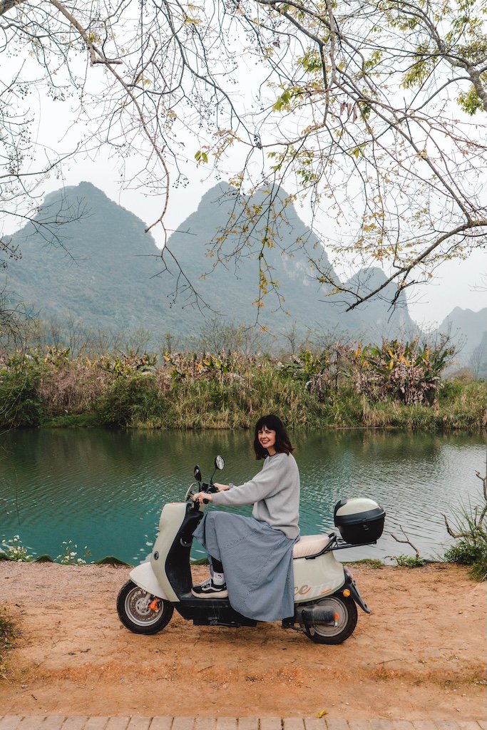 Sin duda esta es de las mejores cosas que hacer en Yangshuo. Puedes alquilar en muchos lugares o incluso en tu propio alojamiento una moto eléctrica o una bici para recorrer Yulonghe Scenic Area.