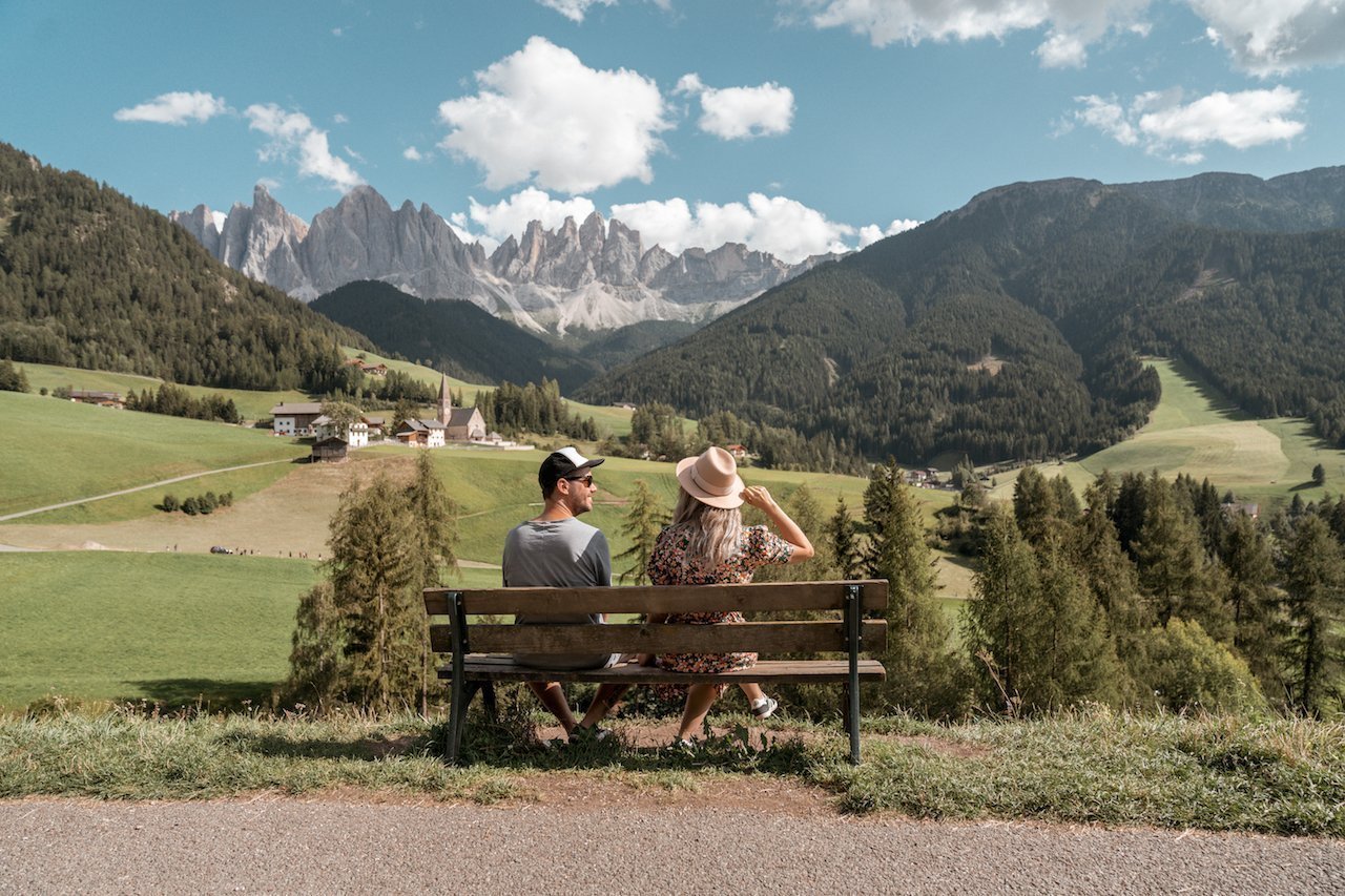 - El Banco con las vistas más bonitas de Dolomitas. Este banco se encuentra en lo alto de una pequeña carretera a la que nosotros accedimos con el coche pero la mayoría de gente subía andando. Una vez que llegas al banco, es bastante difícil dejar el coche porque apenas hay sitio. Nosotros lo dejamos al lado de unas casas que hay pasado el banco. Te dejamos la localización exacta en el mapa. Las vistas desde aquí son espectaculares.