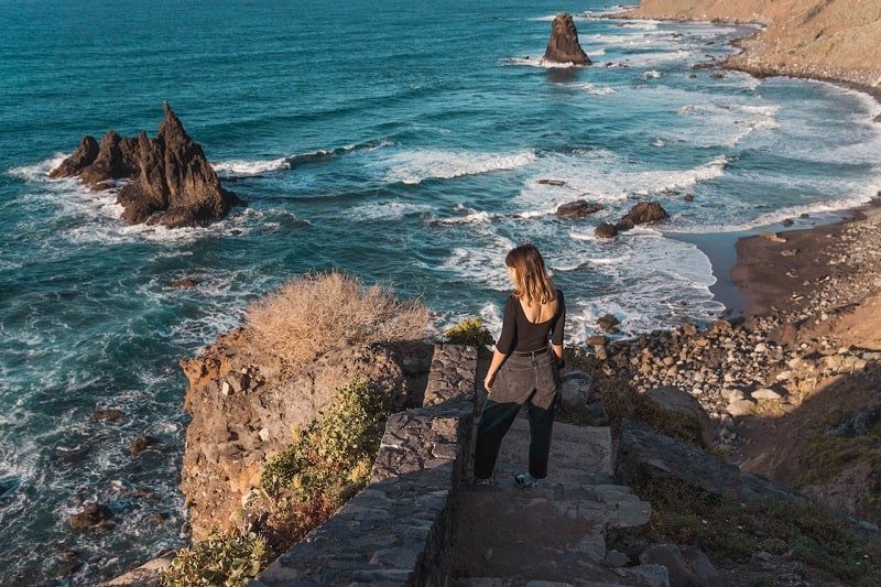 - Playa de Benijo. Una de las más bonitas de la isla. Salvaje, de arena negra. El acceso es a través de unas escaleras, algunos tramos en mal estado y bastante empinadas. Pero con cuidado, se hace sin problema. Las escaleras empiezan junto al restaurante El Mirador. Es una playa super bonita para ver el atardecer, pero el camino de vuelta está lleno de curvas y montañas y no lo vimos bien para hacerlo de noche hasta el Puerto de la Cruz.