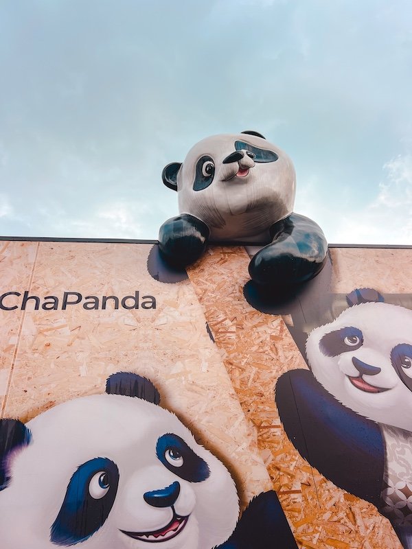 También hay una zona con muchos puestos donde venden comida, bebida y cosas de pandas.